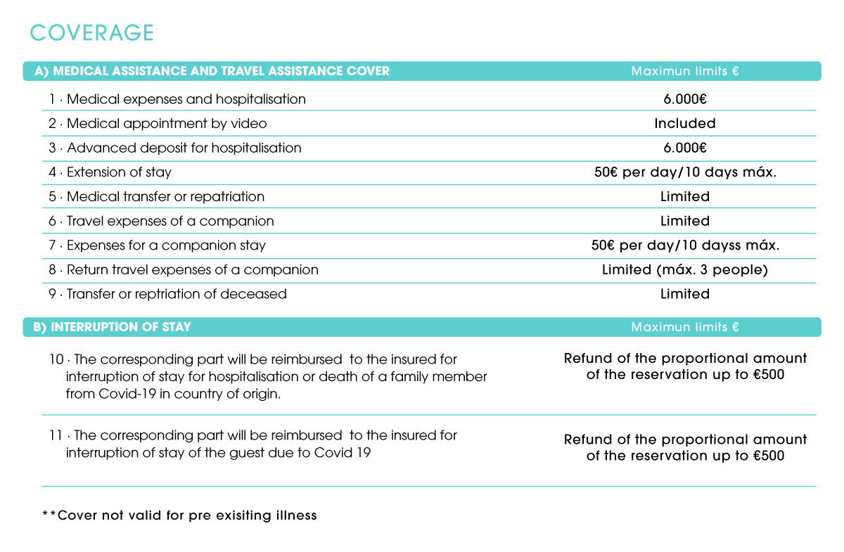 In addition to our COVID-19 safety, health and cleaning protocols, when you make your reservation you will have complete medical insurance included for you and your family completely free of charge.